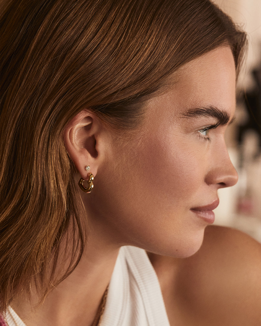 The Lou Statement Heart Huggies is a versatile pair of earrings that adds a touch of elegance to any look. Wear it solo for subtle shine or layered with other favorites for a personalized, effortless style.